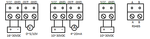 根據(jù)選型不同,其接線方式會不同,下圖分別為電壓輸出、電流輸出、RS485輸出接線方式: